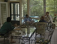 During what Dad has termed Mom's "encore" over the last three weeks (since her intravenous meds began), Mom has maintained a fairly even and high level of energy, enthusiasm, appetite, and ability which almost mimic her pre-tumor days. Since the veil of chronic low-level pain has been lifted with morphine's help, Mom's truest essence seems to be radiating through, more brightly than ever. No matter how long this encore lasts, it has been a blessing for us all, as well as a challenge, as we caregivers try to keep up with Mom's wit, demands, and accelerated engagement with life. Mom still spends much of her day in the hospital bed, but the duration of her naps has decreased to 1-2 shorter naps midday. She has been waking ready to plan and execute "excursions," which often involve shopping - for Christmas presents, new sneakers, sundae spoons for the kitchen. We have planned a few of these excursions, only to postpone them for a moment of better energy. A few of the shopping trips we hope to do via the Internet or catalogs. The night I arrived (at the peak of the Hurricane Floyd evacuations), Mom awoke at 3 a.m. with a pressing need to venture to the front of the house to watch the storm reports on TV. Later that day, Mom spent four hours out on our new screened porch in her wheelchair, taking in the gray skies and gusty winds which were all Gainesville ever saw of the monster hurricane. She has spent more time out there recently, entertaining guests, having lunch, and enjoying the sights and sounds of the woods - barred owls, wild turkeys, deer. Mom's biggest excursion (since her journey to New England this summer) was a trip to the United Church of Gainesville, where she and Dad have been members since 1993, for the late morning service last Sunday. Mom had heard that the associate minister would be preaching on empowerment, and decided that it was a topic she wanted to learn more about. So, perfumed and bejeweled and breakfasted, Mom wheeled into the service and into the hugs and well wishes of many concerned friends. Being a part of worship, more actively than she had in months, enriched Mom rather than depleting her of energy. Mom's frequent response to people about her situation was that "it's far beyond us now - it's so much vaster - I feel as if we are in a vortex of love and blessings all around us..." Other examples of Mom's renewed strength and energy include squatting exercises (which she practices during moments of transition from sitting to standing) to work on her quads, her spontaneous dance moves (when there is music), her increased stamina for walking more than the few steps from bed to commode, and her excited rising from the wheelchair for a welcome home hug when Blake returned from a 10-day trip to Boston. She talks excitedly about planning her birthday party (in late October) and about a fall foliage tour in New England. Her phone check-ins with friends have become more frequent and clear, though she still requires rest when she hangs up. The six quarts of Brigham's mocha almond ice cream (Mom's 30-year favorite) arrived from Boston Wednesday morning, lovingly packed in dry ice by Mom's sister Sherry, and less than three days later, 2 quarts have disappeared. Apparently the almonds in the ice cream are "a good source of protein" which is important to healing. Mom no longer needs our help to get utensil to mouth, and she is full of meal ideas - a far cry from the radiation-induced anorexia of the spring and summer. Often her requests add up to multiple course meals - "How about some crabmeat salad on a baguette, and some string beans, and then some sweet corn, and one of Blake's mango smoothies and then a little mocha almond?" The night after the Hurricane scare, Mom initiated an telephone order of take-out Indian food from her favorite restaurant in Ocala, and we nominated Dad to make the 90-mile round trip to pick it up. Always the family's culinary coordinator, Mom was relieved to hear that church members had volunteered to provide meals for us three days a week - "it's important for us to have healthy food around." Not only has Mom rejoined us in singing grace before supper (occasionally in a round), but she has also resumed her place as primary harmonizer in other family songs, mostly lullabies. Mom's Maine jokes are still told in a gruff Down East accent, and she can slip into an Irish brogue effortlessly. She and Blake exchange words in French and Spanish, and her Bronx upbringing is evident in the New York accent she puts on. Always a good storyteller, Mom hasn't lost her knack for jokes, and seems to have improved ability for double entendres and puns. Blake accused Mom of teasingly threatening to squirt him with her spring water bottle, and she attempted to tickle me into submission a few days prior. We also spent an hour one afternoon splayed out on the bed so she could try to braid my (very short) hair. Aside from the encore and the silliness and the hearty appetite, there is a real specter on our heels. Or, is there? I find myself so easily lulled into believing that there has been a cure, that we are witnessing a miracle recovery, that something other than morphine has slipped into Mom's IV line and dissolved the tumor. But Mom's limited energy and obvious need for the comfort that the meds provide jerks me back to the reality that this may be the last season we spend together and that every day in itself is a miracle to be enjoyed. Mom recognizes the inevitable and appreciates the perspective that this boost has brought her. A friend's letter the other day marveled at Mom's full life, and Mom agreed happily that she had been lucky to have lived so fully for 56 years. She chuckled and mm-hmm'ed as I read aloud passages from The Tibetan Book of Living and Dying to her about dying as a part of life's continuum, and about softening into the learning of the moment instead of resisting change. Mom is tantalized by philosophical questions such as one posed to he